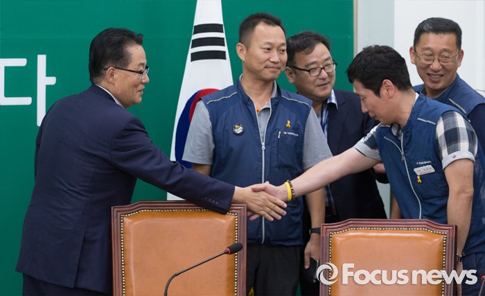 (서울=포커스뉴스) 박지원(왼쪽 첫번째) 국민의당 비상대책위원장이 8일 오후 서울 여의도 국회에서 김주업(왼쪽 두번째) 전국공무원노조 위원장 등 관계자들과 면담에 앞서 인사하고 있다.