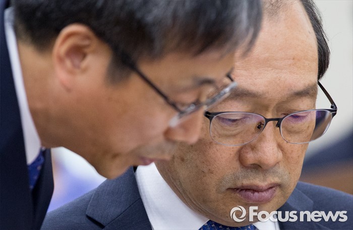 (서울=포커스뉴스) 8일 오후 서울 여의도 국회에서 열린 국방위원회 전체회의에 참석한 장명진 방위사업청장이 관계자와 대화하고 있다.