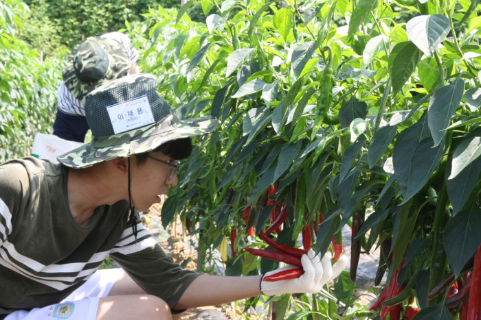또 회사 차원에서 봉사단(나눔봉사단)을 구성해 주변의 어려운 이웃들을 위한 지원 사업을 전개하는 등 기업의 사회적 책임을 적극 실천해 올해 초에는 장애인 고용촉진 장관상을 수상하기도 했다.'나눔 봉사활동'에 참여한 효성ITX 임직원의 자녀가 고추를 따고 있다.<사진제공=효성>