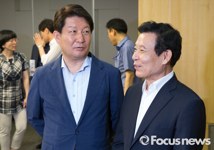(서울=포커스뉴스) 8일 오후 서울 여의도 국회 의원회관에서 열린 광주시-대구시 예산·정책 간담회에 참석한 권영진(왼쪽) 대구시장과 윤장현 광주시장이 대화하고 있다.