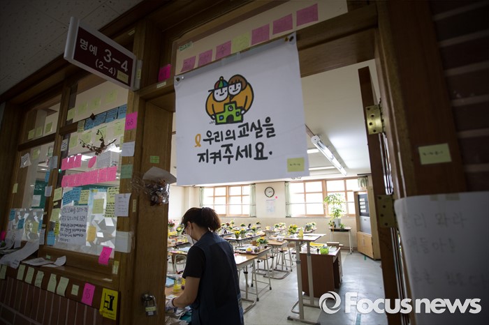 (안산=포커스뉴스) 세월호 참사에서 희생된 단원고등학교 학생들의 교실 이전 절차가 시작된 8일 오후 4.16 기억 저장소 관계자들과 자원봉사자들이 경기도 안산시 단원고등학교에서 교실 이전을 위한 준비 작업으로 '종이 유물 정리'를 하고 있다.