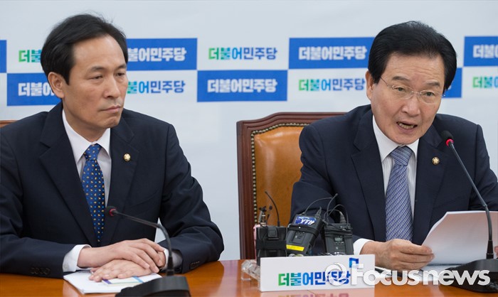 (서울=포커스뉴스) 9일 오전 서울 여의도 국회에서 열린 더불어민주당 원내대책회의에 참석한 변재일 정책위의장이 발언하고 있다. 왼쪽은 우상호 원내대표.