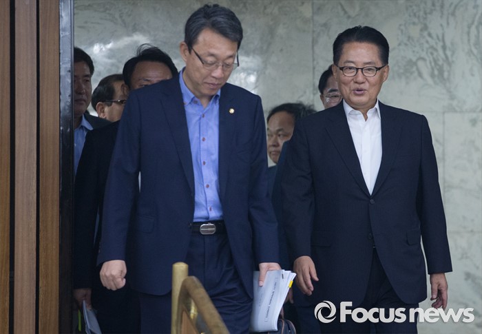 (서울=포커스뉴스) 9일 오전 서울 여의도 국회에서 열린 국민의당 의원총회에 박지원(오른쪽) 비상대책위원장과 김성식 정책위의장 등이 참석하고 있다.