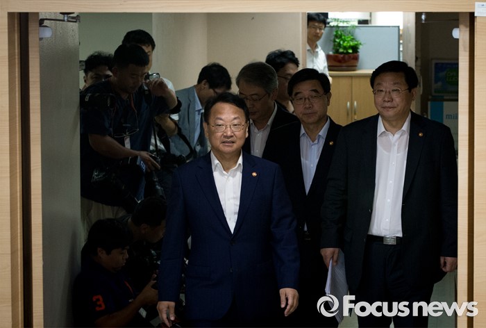 (서울=포커스뉴스) 9일 오전 정부서울청사에서 열린 '2016년 추경예산안 국회 조기통과' 관련 합동브리핑에 참석한 유일호(맨 앞) 경제부총리 겸 기획재정부 장관 및 관계부처 장차관들이 회견장에 들어오고 있다.