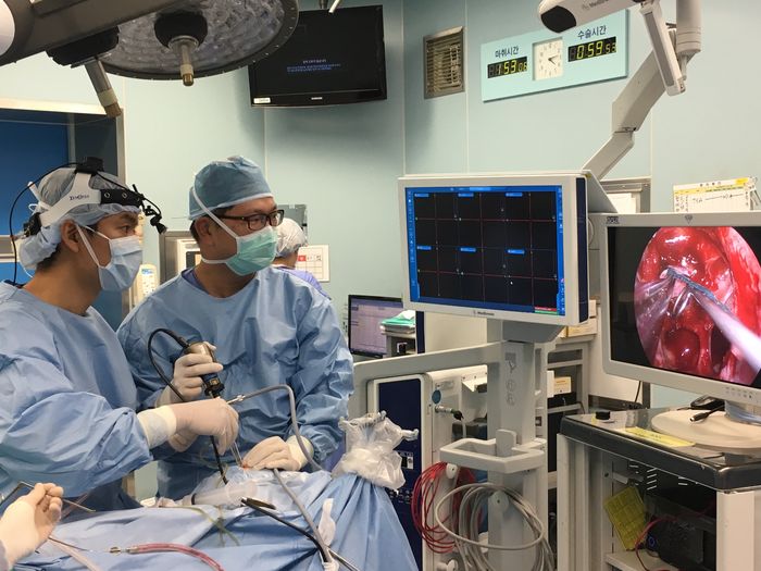 한편, 삼성서울병원은 현재 신경외과 남도현·공두식 교수와 이비인후과 홍상덕 교수를 주축으로 뇌종양 내시경수술 클리닉을 개설해 매년 200여명의 환자를 치료하고 있다.삼성서울병원 공두식신경외과교수(사진 오른쪽)와 홍상덕 이비인후과 교수가 내시경으로 뇌종양 수술을 진행하고 있다. <사진출처=삼성서울병원>