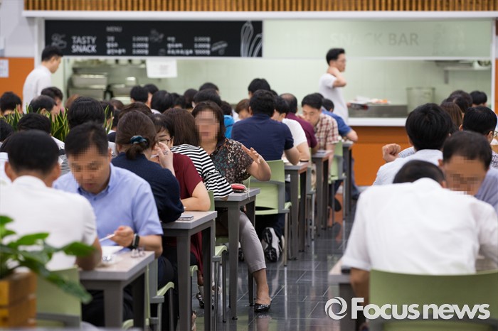 (서울=포커스뉴스) 수도권 대부분 지역에 엿새째 폭염경보가 내려진 9일 오전 서울 중구 한 구내식당이 직원들로 붐비고 있다.