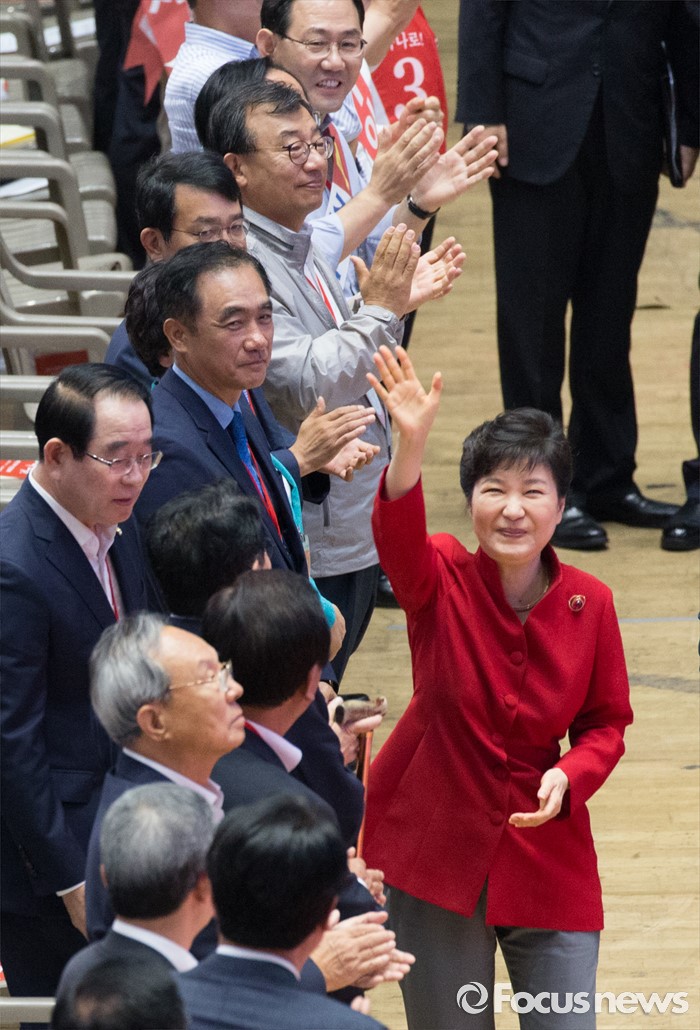 (서울=포커스뉴스) 박근혜 대통령이 9일 오후 서울 송파구 잠실실내체육관에서 제4차 새누리당 전당대회에 입장하며 인사를 하고 있다.