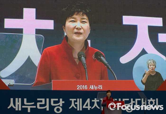 (서울=포커스뉴스) 박근혜 대통령이 9일 오후 서울 송파구 잠실실내체육관에서 열린 새누리당 4차 전당대회에 참석해 축사를 하고 있다.