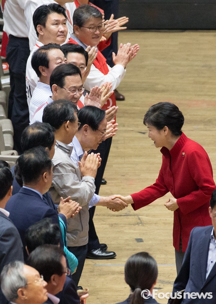 (서울=포커스뉴스) 박근혜 대통령이 9일 오후 서울 송파구 잠실실내체육관에서 제4차 새누리당 전당대회에 입장하며 당-원내대표 후보자들과 인사를 나누고 있다.