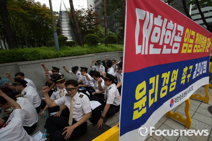 (서울=포커스뉴스) 9일 오후 서울 종로구 서울지방국세청 앞에서 열린 대한항공 경영정상화를 위한 세무조사 촉구대회에서 대한항공 조종사 노동조합 조합원들이 구호를 외치고 있다.