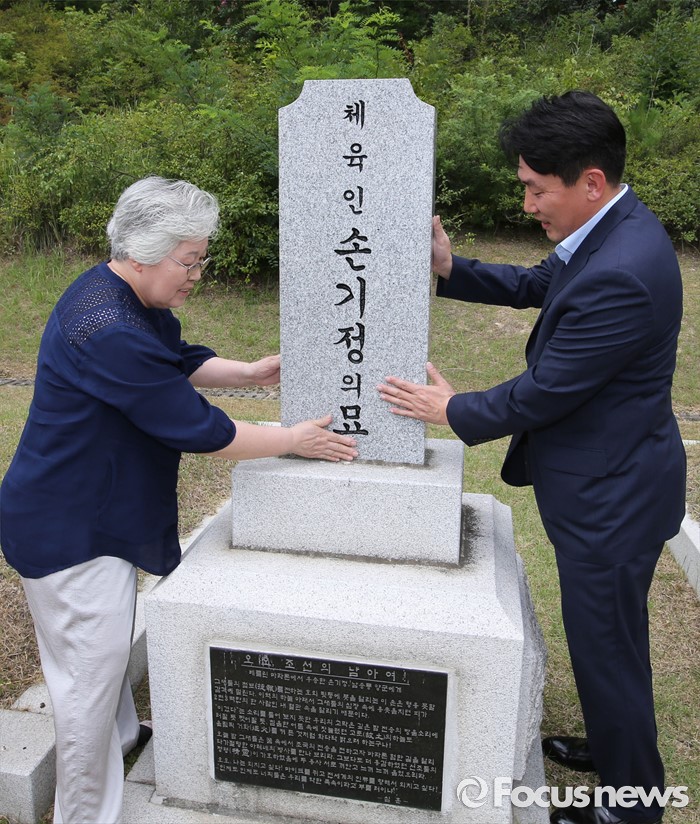(대전=포커스뉴스) 9일 오후 대전 유성구 국립대전현충원 국가사회공헌자묘역에서 베를린 올림픽 마라톤 금메달리스트 손기정 선수의 딸 손문영 여사와 외손주인 이준승 손기정기념재단 사무총장이 손기정 선수 묘소에 헌화를 마치고 묘비를 만지고 있다. 손기정 선수는 80년 전인 1936년 8월 9일 베를린 올림픽 마라톤에서 금메달을 목에 걸었다.