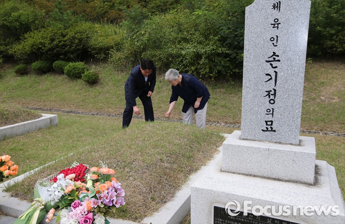 (대전=포커스뉴스) 9일 오후 대전 유성구 국립대전현충원 국가사회공헌자묘역에서 베를린 올림픽 마라톤 금메달리스트 손기정 선수의 딸 손문영 여사와 외손주인 이준승 손기정기념재단 사무총장이 손기정 선수 묘소에 헌화하고 묘역을 둘러보고 있다. 손기정 선수는 80년 전인 1936년 8월 9일 베를린 올림픽 마라톤에서 금메달을 목에 걸었다.