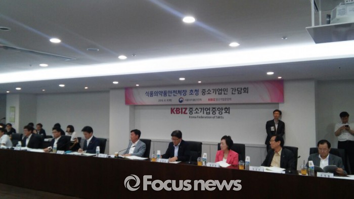 손문기 식약처장과 박성택 중기중앙회장을 비롯 이연수·심승일·주대철 부회장 등 중기중앙회 회장단, 한무경 한국여성경제인협회장, 이규대 이노비즈협회장, 조동민 프랜차이즈산업협회장, 최승재 소상공인연합회장 등 중소기업계 대표 20여명이 참석, 현장 목소리를 전달했다.