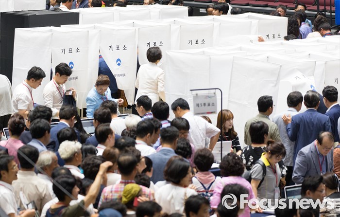 (서울=포커스뉴스) 9일 오후 서울 송파구 잠실실내체육관에서 열린 제4차 새누리당 전당대회에서 당원들이 당대표 및 최고위원을 선출하기 위해 투표를 하고 있다.