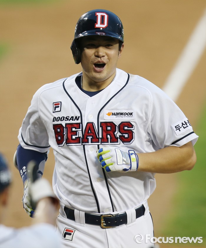 (서울=포커스뉴스) 9일 서울 잠실구장에서 열린 2016 프로야구 KIA-두산 경기 2회말 1사 1,3루에서 두산 김재환이 우월 3점 홈런을 날리고 홈인하고 있다.