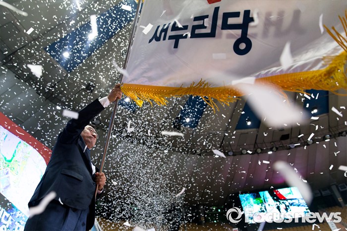 (서울=포커스뉴스) 9일 오후 서울 송파구 잠실실내체육관에서 열린 제4차 새누리당 전당대회에서 당대표로 선출된 이정현이 당기를 흔들어보이고 있다.
