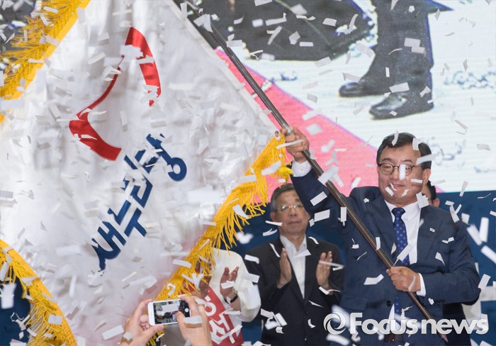 (서울=포커스뉴스) 9일 오후 서울 송파구 잠실실내체육관에서 열린 새누리당 4차 전당대회에 참석한 이정현 의원이 당대표로 선출된 후 당기를 흔들고 있다.
