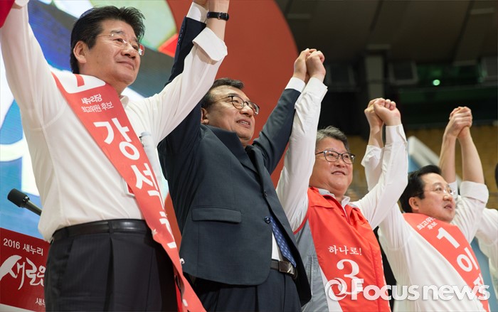 (서울=포커스뉴스) 9일 오후 서울 송파구 잠실실내체육관에서 열린 제4차 새누리당 전당대회에서 당대표로 선출된 이정현(오른쪽 두번째)이 만세를 외치고 있다. 왼쪽부터 최고위원에 선출된 강석호, 이 대표, 조원진, 이장우.