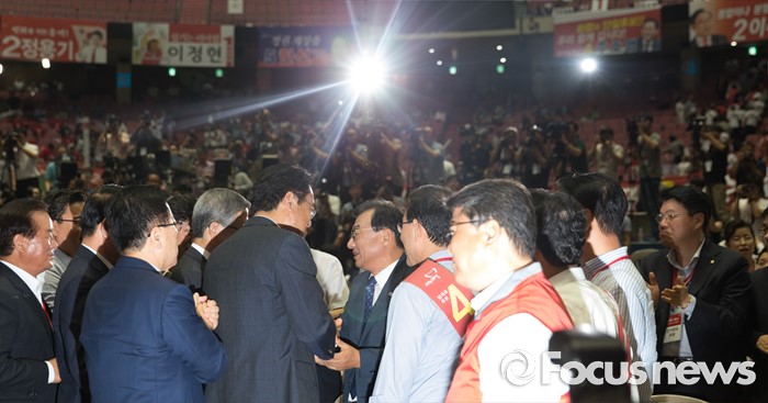 (서울=포커스뉴스) 9일 오후 서울 송파구 잠실실내체육관에서 열린 제4차 새누리당 전당대회에서 당대표로 선출된 이정현이 김희옥 혁신비대위원장과 정진석 원내대표의 축하를 받고 있다.