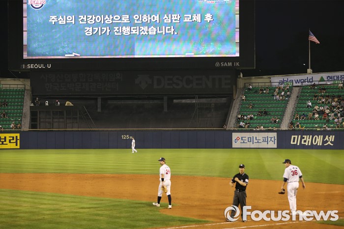 (서울=포커스뉴스) 9일 서울 잠실구장에서 열린 2016 프로야구 KIA-두산 경기에서 3회를 마치고 김풍기 주심의 건강이상으로 대기심과 교체하느라 경기가 잠시 중단됐다.