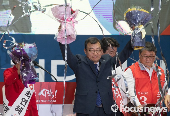 (서울=포커스뉴스) 9일 오후 서울 송파구 잠실실내체육관에서 열린 새누리당 4차 전당대회에서 당대표로 선출된 이정현 의원이 손을 들어 인사하고 있다.