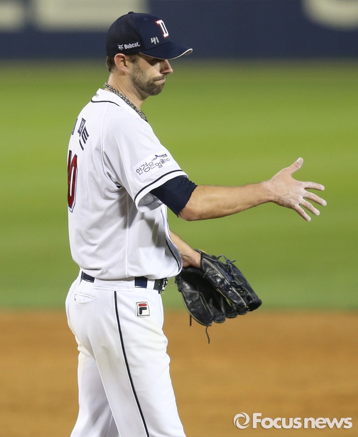 (서울=포커스뉴스) 9일 서울 잠실구장에서 열린 2016 프로야구 KIA-두산 경기 4회초 1사후 두산 투수 니퍼트가 KIA 김주찬을 몸에 맞는 볼로 진루시키고 사과의 사인을 보내고 있다.