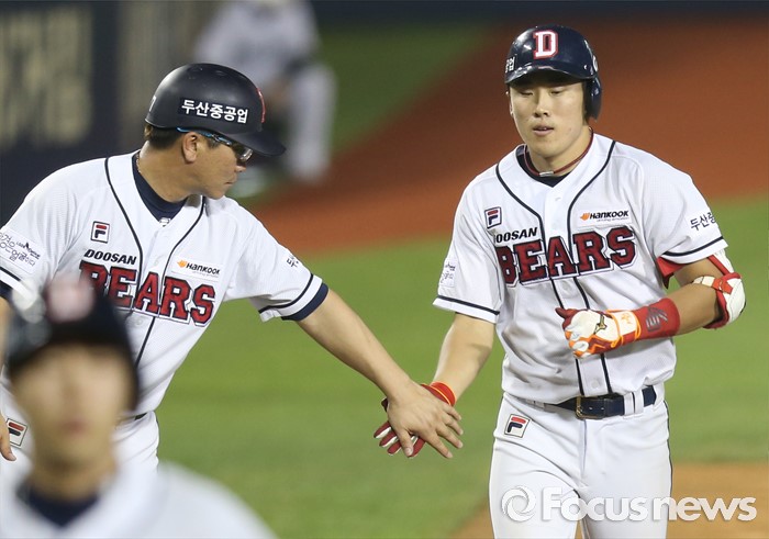 (서울=포커스뉴스) 9일 서울 잠실구장에서 열린 2016 프로야구 KIA-두산 경기 7회말 2사 1,2루에서 두산 허경민이 좌월 3점 홈런을 치고 3루를 돌며 전형도 코치의 환영을 받고 있다.