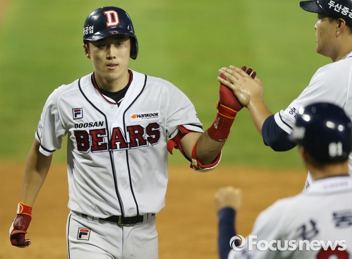 (서울=포커스뉴스) 9일 서울 잠실구장에서 열린 2016 프로야구 KIA-두산 경기 7회말 2사 1,2루에서 두산 허경민이 좌월 3점 홈런을 치고 선행주자 오재일의 환영을 받으며 홈인하고 있다.