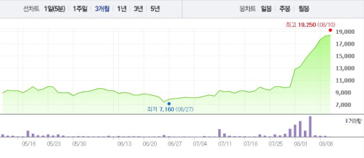 이는 1달 전 주가인 7월11일(9330원)과 비교했을 때 97.21% 상승한 수치다.