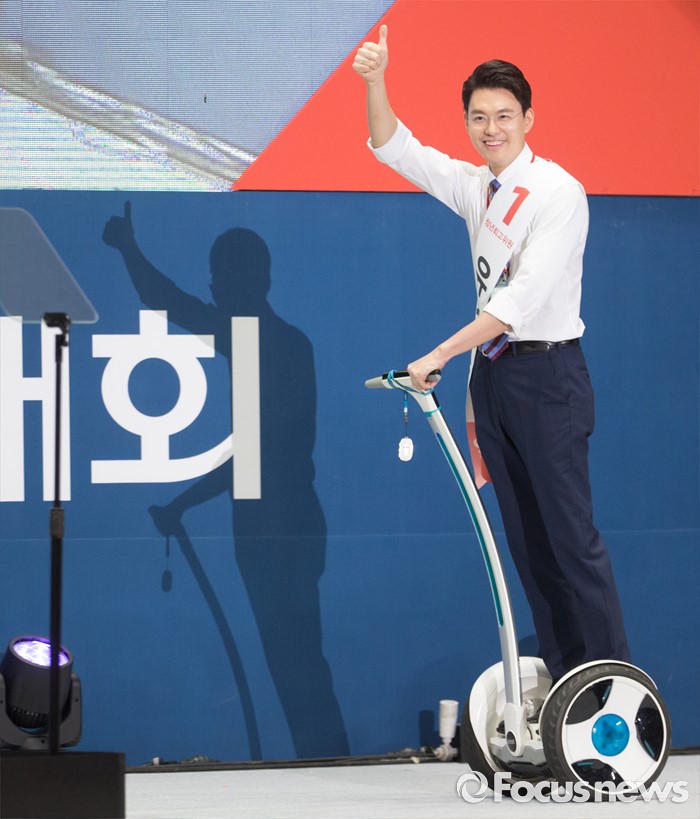 유창수 최고위원은 전날 열린 전당대회에서 조직력을 앞세운 이부형 당 중앙청년위원장에게 약 1200표차(9.4%p) 앞선 54.7%의 지지를 얻어 청년 최고위원에 선출됐다. 유 최고위원은 전당대회 당일 무인전동차인 세그웨이(segway)를 타고 입장하는 재치를 보이기도 했다.9일 오후 서울 송파구 잠실실내체육관에서 열린 새누리당 4차 전당대회에 참석한 유창수 최고위원 후보가 입장하고 있다. 2016.08.09 박동욱 기자
