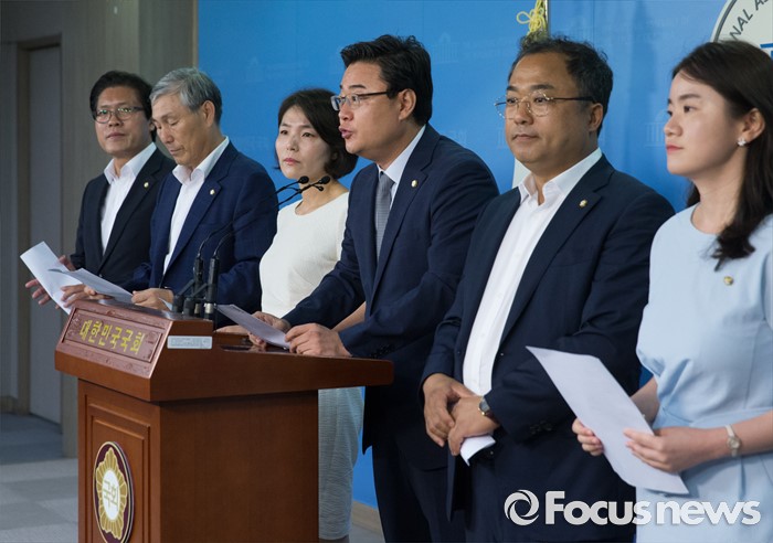 (서울=포커스뉴스) 새누리당 초선 의원들이 10일 오전 서울 여의도 국회 정론관에서 더불어민주당 초선 의원들의 방중 관련 기자회견을 하고 있다. 왼쪽부터 송석준, 조훈현, 전희경, 김성원, 권석창, 신보라 의원.