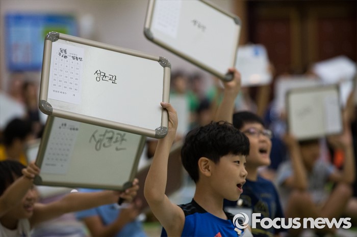 (서울=포커스뉴스) 10일 오전 서울 성동구 성동구청 대강당에서 열린 '성동 어린이 독서 골든벨'에서 초등학생들이 정답판을 들고 있다.