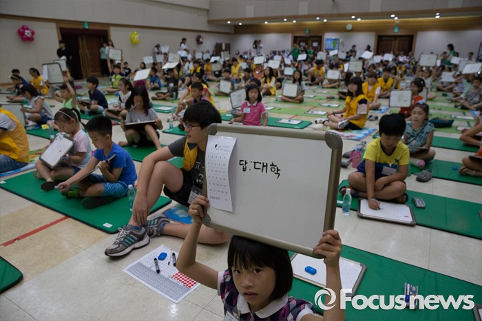 (서울=포커스뉴스) 10일 오전 서울 성동구 성동구청 대강당에서 열린 '성동 어린이 독서 골든벨'에서 초등학생들이 정답판을 들고 있다.