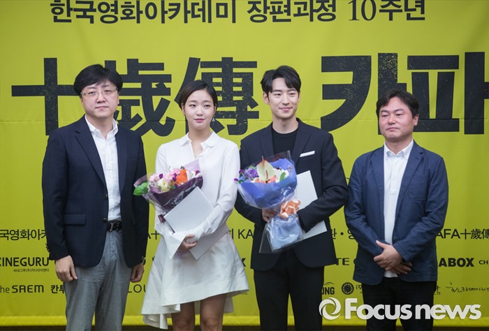 (서울=포커스뉴스) 10일 오전 서울 중구 프레스센터에서 열린 '한국영화아카데미 장편과정 10주년 카파 십세전' 홍보대사 위촉식 참석자들이 포토타임을 갖고 있다. 왼쪽부터 유영식 조직위원장, 배우 김고은, 이제훈, 김이다 집행위원장