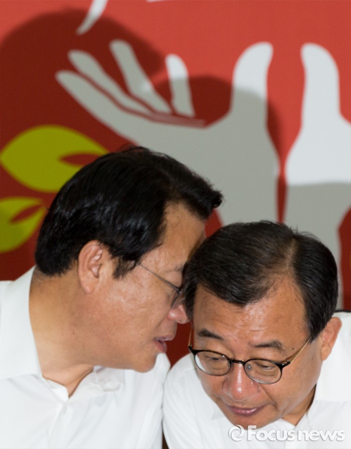 (서울=포커스뉴스) 이정현(오른쪽) 새누리당 대표와 정진석 원내대표가 10일 오전 서울 여의도 새누리당사에서 열린 최고위원회의에 참석해 대화 하고 있다.