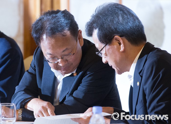 (서울=포커스뉴스) 10일 오후 서울 여의도 국회 사랑재에서 열린 지역경제 활성화를 위한 규제프리존 특별법 왜 필요한가? 간담회에 참석한 유일호(왼쪽) 경제부총리 겸 기획재정부 장관과 이시종 충북도지사가 대화하고 있다.