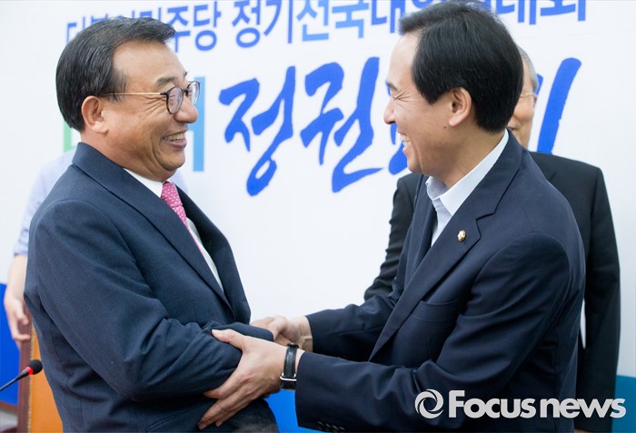 (서울=포커스뉴스) 10일 오후 서울 여의도 국회에서 이정현(왼쪽) 새누리당 신임 대표가 김종인 더불어민주당 비대위 대표와 만나 면담을 나눈 뒤 이동하던 중 갑작스럽게 방문한 우상호 더불어민주당 원내대표가 인사하고 있다.