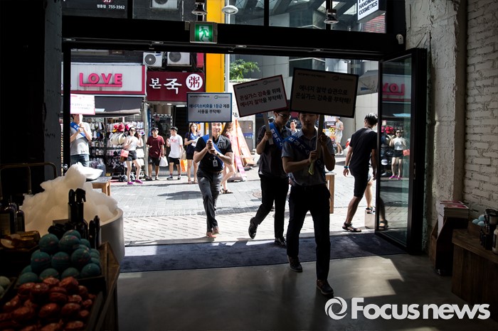(서울=포커스뉴스) 서울시, 산업부 관계자들이 10일 오후 서울 중구 명동의 한 가게에서 에너지 절약 캠페인을 벌이고 있다. 지난 9일 폭염으로 인한 전력 수요 급증에 정부는 오는 11일부터 개문냉방 업소 단속에 나선다고 밝혔다.