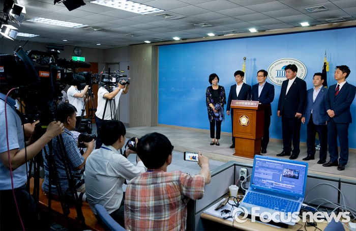 (서울=포커스뉴스) 방중을 마치고 귀국한 더불어민주당 초선 의원들이 10일 오후 서울 여의도 국회 정론관에서 기자회견을 하고 있다. 왼쪽부터 손혜원, 김병욱, 신동근, 소병훈, 박정, 김영호 의원.