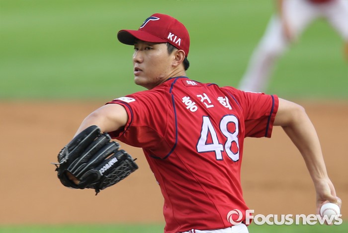 (서울=포커스뉴스) 10일 서울 잠실구장에서 열린 2016 프로야구 KIA-두산 경기에서 1회말 KIA 선발투수 홍건희가 투구하고 있다.
