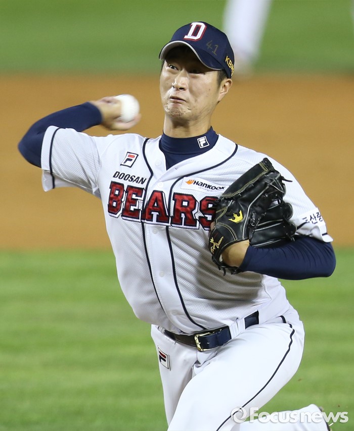 (서울=포커스뉴스) 10일 서울 잠실구장에서 열린 2016 프로야구 KIA-두산 경기 6회초 2사 만루에서 구원 등판한 두산 투수 고봉재가 KIA 나지완을 상대로 투구하고 있다.