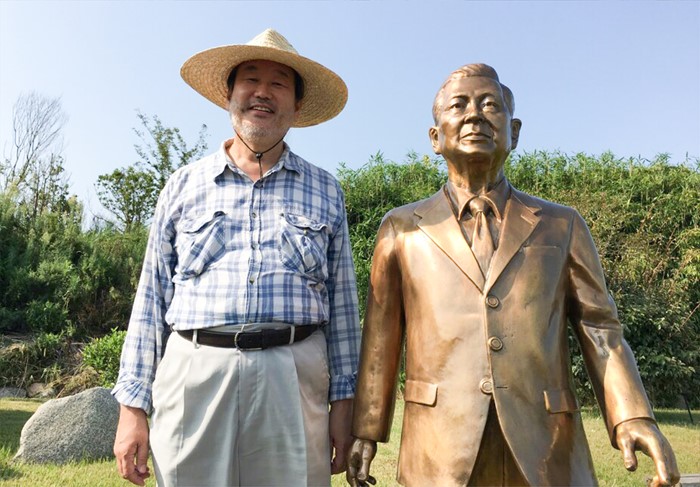 (서울=포커스뉴스) 전국 민심투어를 재개한 김무성 새누리당 전 대표가 10일 오후 전남 신안군 하의도를 방문해 故 김대중 전 대통령 동상과 함께 기념촬영을 하고 있다. <사진제공=김무성 전 대표 페이스북>