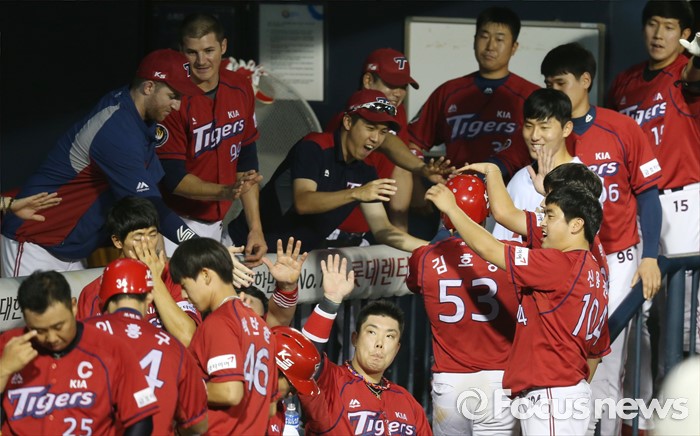 (서울=포커스뉴스) 10일 서울 잠실구장에서 열린 2016 프로야구 KIA-두산 경기 7회초 2사 2,3루에서 KIA 노수광의 우전 안타로 홈인한 김호령과 이홍구가 더그아웃에서 동료들의 환영을 받고 있다.