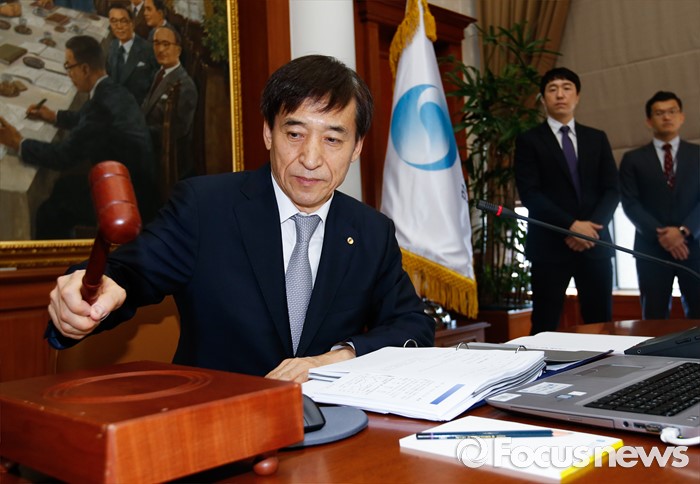 (서울=포커스뉴스) 11일 오전 서울 중구 한국은행에서 열린 제15차 금융통화위원회에 참석한 이주열 한국은행 총재가 개회를 알리는 의사봉을 두드리고 있다.