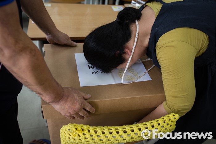 (안산=포커스뉴스) 세월호 참사에서 희생된 단원고등학교 학생들의 교실 이전 절차가 진행 중인 11일 오전, 경기도 안산시 단원고등학교 기억교실에서 희생 아이들 가족들이 책상 정리를 하며 슬픔에 젖어 있다.