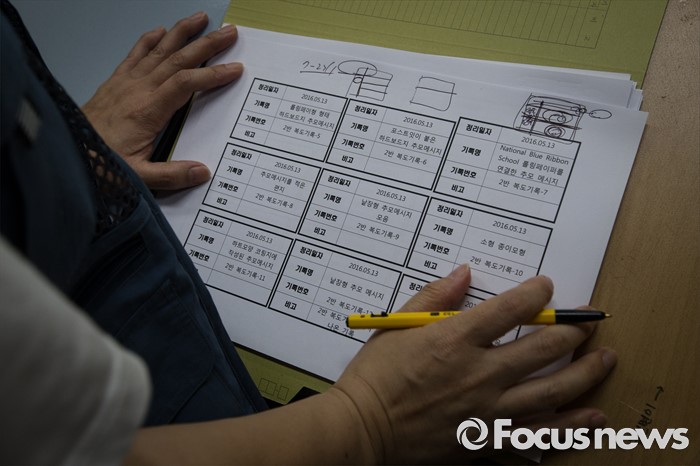 (안산=포커스뉴스) 세월호 참사에서 희생된 단원고등학교 학생들의 교실 이전 절차가 진행 중인 11일 오전 경기도 안산시 단원고등학교 기억교실에서 교실 이전을 돕는 봉사자들이 옮겨갈 물품들을 기록하고 있다.