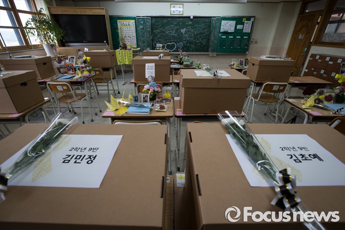 (안산=포커스뉴스) 세월호 참사에서 희생된 단원고등학교 학생들의 교실 이전 절차가 진행 중인 11일 오전 경기도 안산시 단원고등학교 기억교실에 아이들 유품 및 기록물 보관함이 쌓여져 있다.