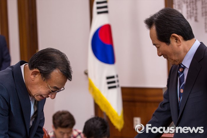 (서울=포커스뉴스) 이정현(왼쪽) 새누리당 대표가 11일 오후 서울 여의도 국회에서 정세균 국회의장을 예방해 면담에 앞서 인사하고 있다.