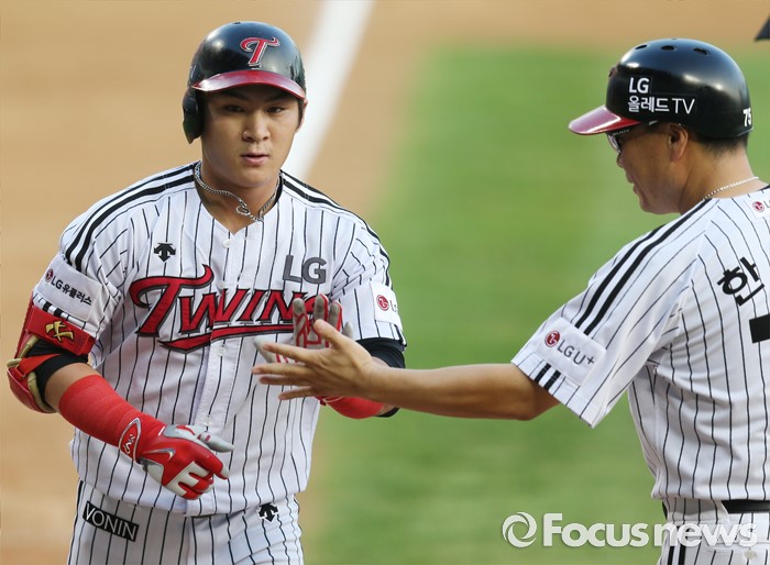 (서울=포커스뉴스) 11일 서울 잠실구장에서 열린 2016 프로야구 NC-LG 경기 2회말 1사후 LG 오지환이 우월 솔로 홈런을 치고 한혁수 코치의 한혁수 코치의 환영을 받으며 홈인하고 있다.