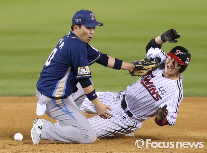 (서울=포커스뉴스) 11일 서울 잠실구장에서 열린 2016 프로야구 NC-LG 경기 4회말 1사 1,3루에서 LG 1루주자 손주인이 2루 도루를 시도해 슬라이딩하며 NC 유격수 지석훈의 글러브에 얼굴을 부딪히고 있다.